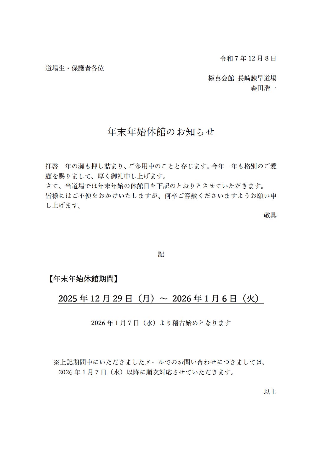 年末年始休館のお知らせ