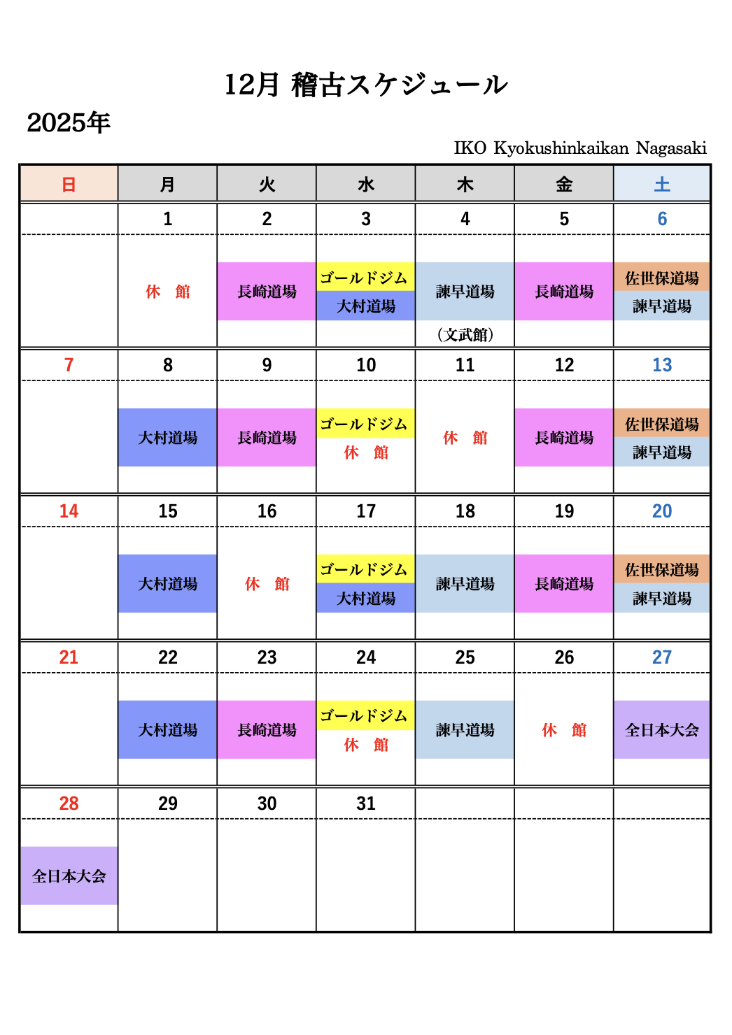 ※【大村道場】12月10日(水)は諸事情により臨時休館とさせていただきます。
